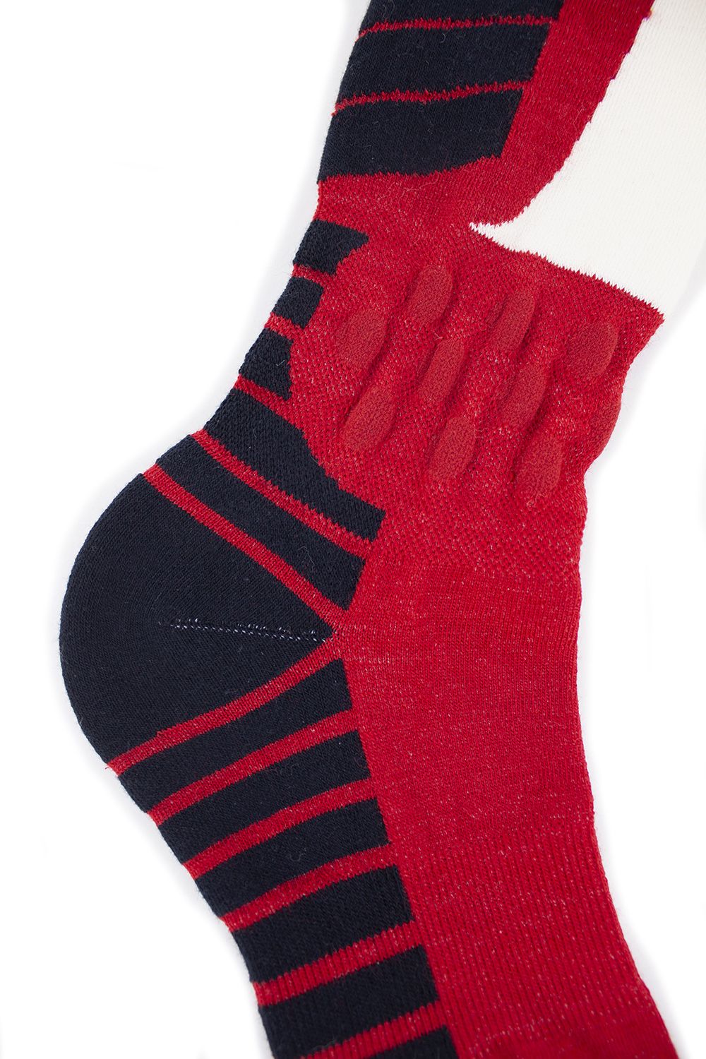 Die verstärkten Bereiche am Schienbein und an der Fußsohle schützen beim Skifahren und bieten Halt an den am stärksten beanspruchten Stellen.
